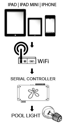 The innovative design of the EP-WI2SL 1.0 allows for easy and flexible integration into a pool lighting control solution via ipad and android systems. The EP-WI2SL 1.0 is a simple wired or wireless conduit between you and your device over a network or the Internet.